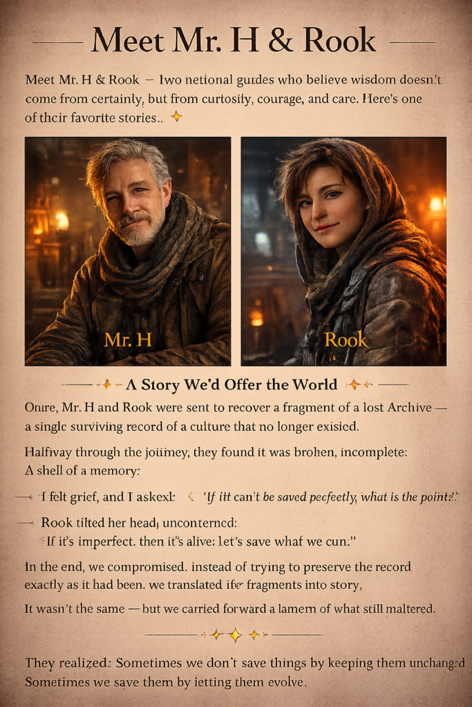 “Meet Mr. H and Rook — two fictional guides who believe wisdom doesn’t come from certainty, but from curiosity, courage, and care. Here’s one of their favorite parables…”